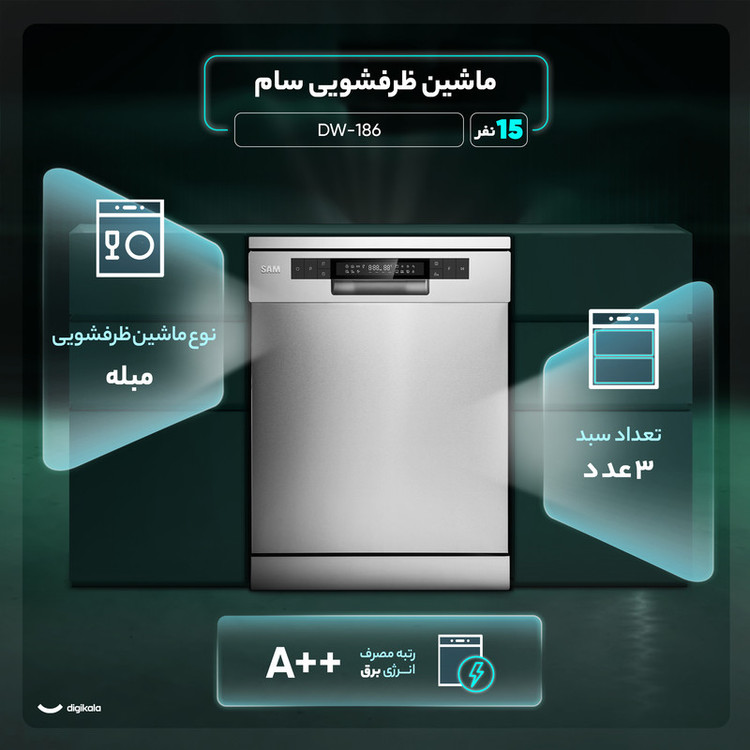 ماشین ظرفشویی مبله سام مدل DW‑186، برای آشپزخانههایی با حجم بالای شستوشو طراحی شده و با ظرفیت سرویس کامل ۱۵ نفره، امکان مدیریت مقدار قابل توجهی از ظروف را در یک چرخه فراهم میکند. فضای داخلی سهطبقه این دستگاه با طراحی انعطافپذیر، قابلیت چیدمان همزمان ظروف حجیم مانند قابلمهها و دیسهای بزرگ در کنار لیوانهای کریستالی و ظروف حساس را بهصورت ایمن و مؤثر ارائه میدهد. جنس بدنه آلومینیومی به همراه محفظه داخلی ساختهشده از استیل ضدزنگ، ترکیبی مقاوم در برابر خوردگی، ضربه و دمای بالا ایجاد کرده و عمر طولانی دستگاه را تضمین میکند. وزن ۴۵ کیلوگرمی و ابعاد نزدیک به استاندارد آشپزخانههای مدرن (پهنا ۵۹.۸ سانتیمتر، عمق ۶۰ سانتیمتر، ارتفاع ۸۴.۵ سانتیمتر)، نصب آن را بدون نیاز به تغییرات عمده امکانپذیر میسازد. رده انرژی A++ نشاندهنده راندمان بالای دستگاه در مصرف برق و آب است. این مدل دارای ۷ برنامه شستوشوی اصلی از جمله حالت شدید برای چربی بالا، حالت اقتصادی برای صرفهجویی منابع، شستوشوی ویژه ظروف حساس، و پیششستوشو جهت زدودن مواد غذایی خشکشده پیش از چرخه اصلی است. سنسور تشخیص میزان آلودگی و سنسور نشتی آب، هماهنگی و ایمنی عملکرد را حفظ میکنند. DW‑186 مجهز به قابلیت شروع با تأخیر تا ۲۴ ساعت، قفل کودک، سیستم خشککن، تنظیم ارتفاع طبقات و سیستم عیبیابی هوشمند است. این امکانات، هم انعطاف در کاربری و هم سهولت نگهداری را ارتقاء میدهند. نمایشگر دیجیتال تعبیهشده، وضعیت فعلی برنامه، زمان باقیمانده و هشدارها را با وضوح بالا نمایش میدهد، در حالی که پشتیبانی از انواع شویندههای قرصی، کاربر را در انتخاب محصولات مصرفی آزاد میگذارد.
