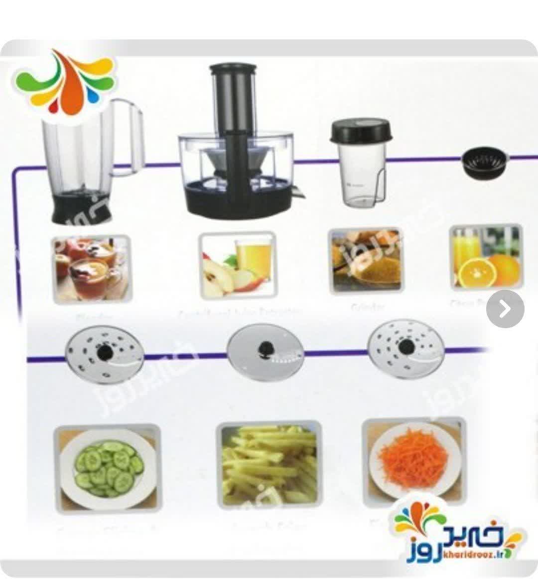 کاردک پلاستیکی, دیسک های رنده, تیغه ها, دربپوش , پارچ مخلوط کن, دفترچه ی راهنما