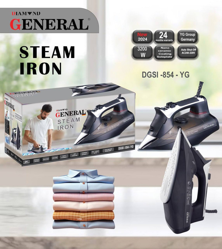 اتو بخار Diamond General مدل DGSI-854-YG با طراحی شیک و عملکرد قدرتمند، این مدل تجربهای بینظیر از اتوکشی سریع، ایمن و حرفهای را برای شما فراهم میکند. توان 3200 وات و کفی نانو سرامیکی، بخاردهی یکنواخت و لغزش روان روی انواع پارچهها را تضمین میکند—از لباسهای نخی گرفته تا پارچههای حساس و ضخیم.