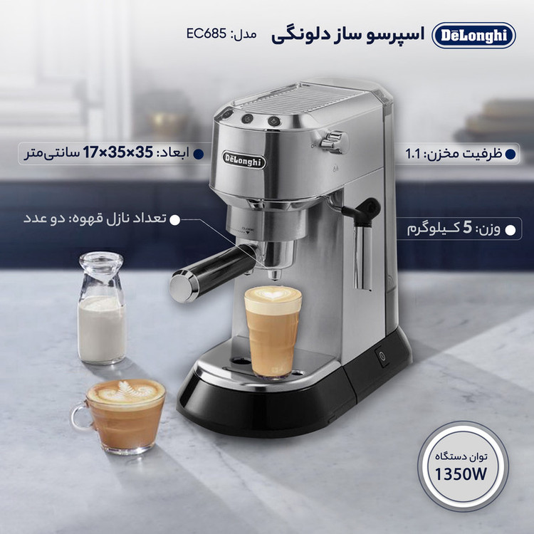 اسپرسو ساز دلونگی مدل EC685پرفروشترین اسپرسوساز برند محبوب دلونگی که بواسطهی زیبایی و جنس خوب بدنه برندی پذیرفتهشده در بین ایرانیان به حساب میآید. این قهوهساز خانگی با طراحی شکیل زیبایی آشپزخانهی شما را تضمین میکند. ابعاد کوچک 35x17x35، وزن 5 کیلوگرمی و جنس بدنه استیل با عمر بالا عامل اصلی محبوبیت این دستگاه دلونگی است. Delonghi ec685 دارای مخرن آب 1.1 لیتری در بخش پشتی است که برای تهیه چندین فنجان قهوه کافی میباشد. توان مصرفی اسپرسوساز دلونگی 1350 وات بوده و فشار بخار در این دستگاه 15 بار است که عدد قابل توجهی برای دستگاه خانگی محسوب میشود . شما علاوه بر اسپرسو میتوانید با کمک بازوی استخراج قهوه و بخار، به راحتی قهوه خود را با کرم صاف و نرمی بدست اورید همچنین لاته، کاپوچینو و آب جوش با این قهوه ساز تهیه کنید. در قسمت زیرین دستگاه سینه چکه گیر وجود دارد که هنگام ریزش مایع، قهوه یا آب، داخل این مخزن ریخته و از کثیف شدن کابینت یا میز شما جلوگیری میکند. این دستگاه دارای پنل گرمکننده در قسمت بالایی، صفحه نمایش LCD و حالت خاموشی خودکار است.