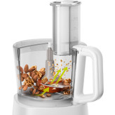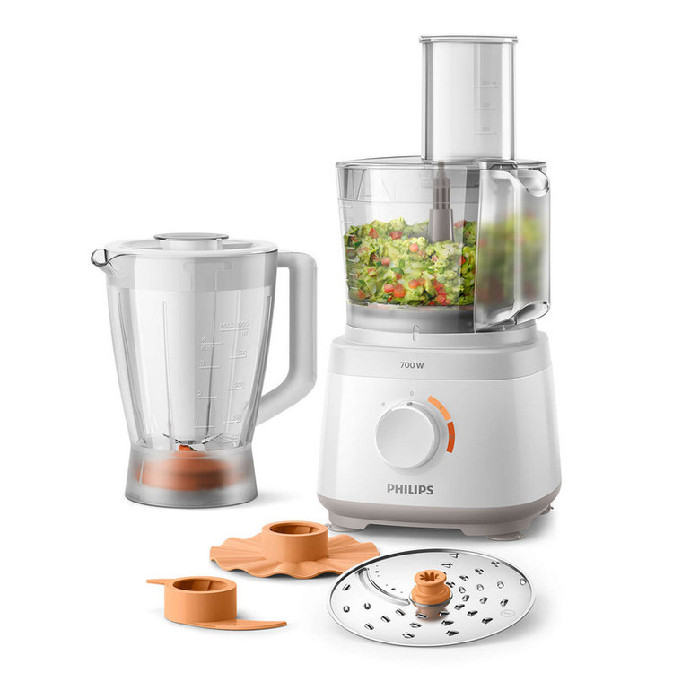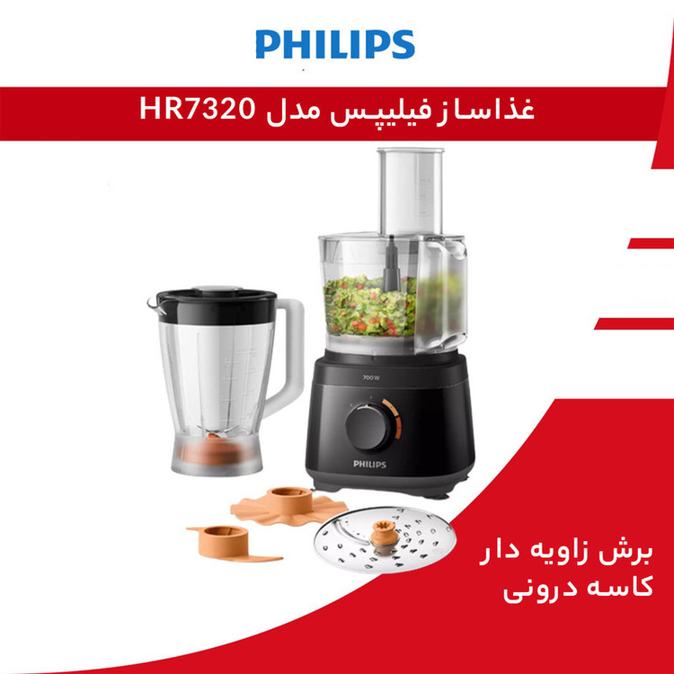 غذاساز فیلیپس مدل HR7320 از سری 73xx که جدیدترین غذاسازهای حرفه ایی فیلیپس هستند می باشد که طراحی ظاهری بسیار زیبا و چشم نوازی دارد. شرکت فیلیپس برای این مدل نسبت به مدل 7310 که مدل اولیه و پایه این سری می باشد امکانات بیشتری قرار داده است هر چند که بطور کل برای این سری اکسسوری های کم استفاده را حذف کرده تا از شلوغی دستگاه و سردرگم شدن برای استفاده از آنها بکاهد و تا حدودی بالا رفتن قیمت بخاطر استفاده از فناوری های مدرن و موتور بهینه تر شده نسبت به سایر سریها را رفع نماید قدرت موتور دستگاه 700 وات می باشد. بدنه دستگاه از پلاستیک فشرده و مقاوم ساخته شده که علاوه بر جلوه ای زیبا به آشپزخانه ها، تمیز کردن بدنه آسان تر می شود. تنظیم سرعت دو حالته همراه با عملکرد لحظه ای می باشد. و از اکسسوری هایی برای عملکردهای خردکن، مخلوط کن، رنده، رب و پوره ساز، خمیر زدن و ...بهره می برد. ظرف خردکن به صورت پلاستیکی شفاف با ظرفیت 2.1 لیتر است که 1.5 لیتر مدرج شده است.مخلوط کن غذاساز امکان مخلوط کردن و تهیه انواع اسموتی ، نوشیدنی ها، پوره کردن سوپ ، آماده کردن غذای بچه و ... را فراهم می سازد و نیز قابلیت خرد کردن تکه های یخ را دارد. درپوش مخلوط کن به گونه ای طراحی شده تا بتوان در حین کار، مواد افزودنی را به مخلوط اضافه کرد. همچنین دستگاه به تکنولوژی Power Chop مجهز گردیده تا بتوان به بهترین نتیجه برای کار کردن با انواع مواد سخت و نرم توسط این فناوری رسید، ترکیب شکل تیغه ، برش زاویه دار و کاسه درونی به گونه ای است که مواد سخت و نرم را می توان با بهترین نتیجه تحویل می دهد. سرعت پیش فرض هر پروسه با رنگبندی اکسسوری ها و ولوم سرعت دستگاه مشخص شده است. دیسک رنده دستگاه دو طرفه می باشد (چیپس ساز و رنده متوسط یا ریز ). دیسک امولسیون ساز و تیغه خمیر زدن بهترین نتیجه را برای کارکردن با مایعات، آرد، تخم مرغ، خمیر، رب و پوره می دهند. قسمتهای پلاستیکی دستگاه که در تماس با مواد غذایی هستند عاری از هرگونه مواد مضر سلامت می باشند . چنانچه قصد خرید غذاساز با قیمت متوسط را دارید این دستگاه با توجه به طراحی زیبایی که کمتر غذاساز دیگری دارد، فناوریهای پیشرفته و موتور بهینه، ابعاد جمع جور و برند معتبر فیلیپس که ضمانت دوام دستگاه می باشد انتخاب بسیار خوبی می باشد.
